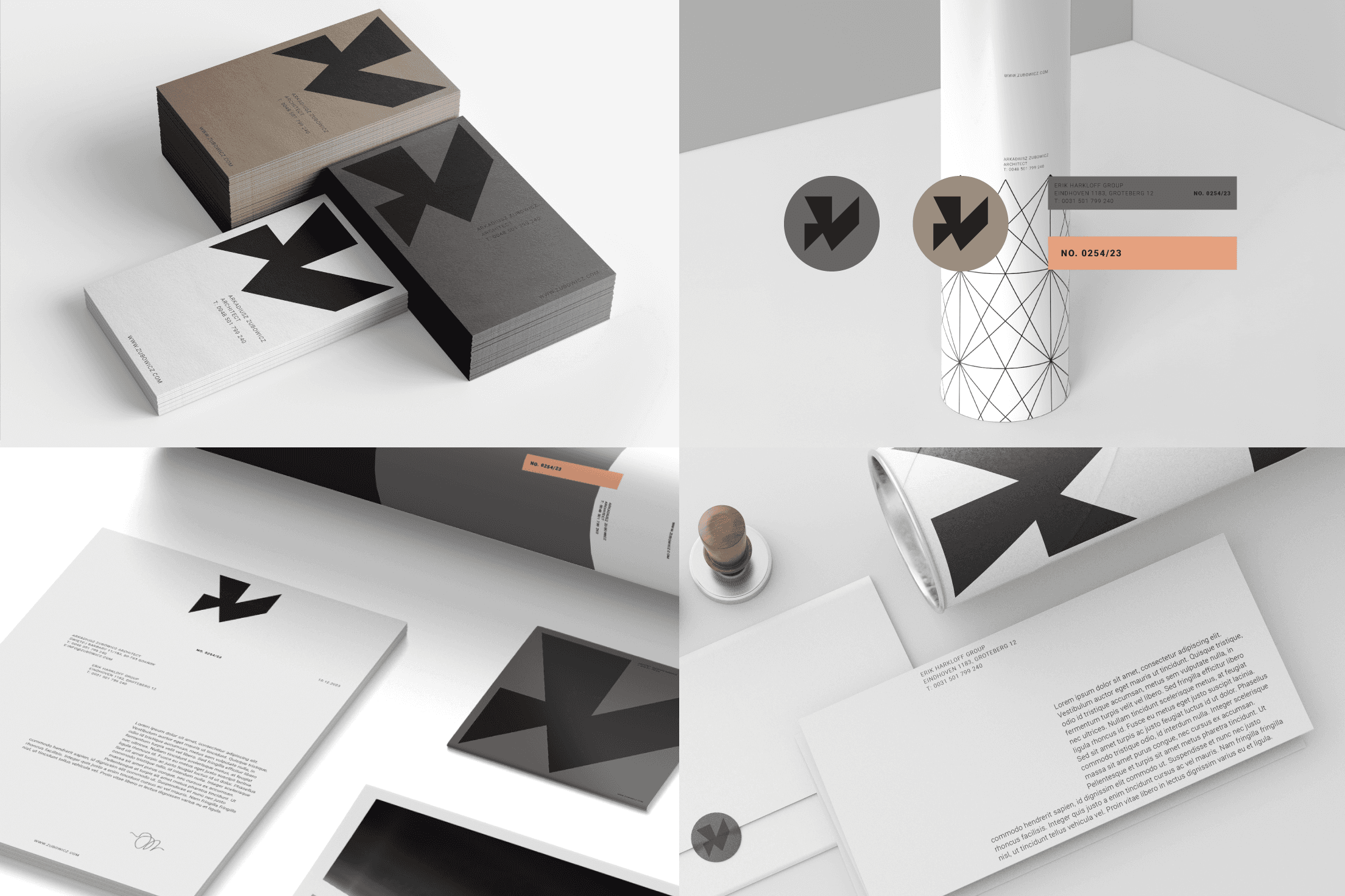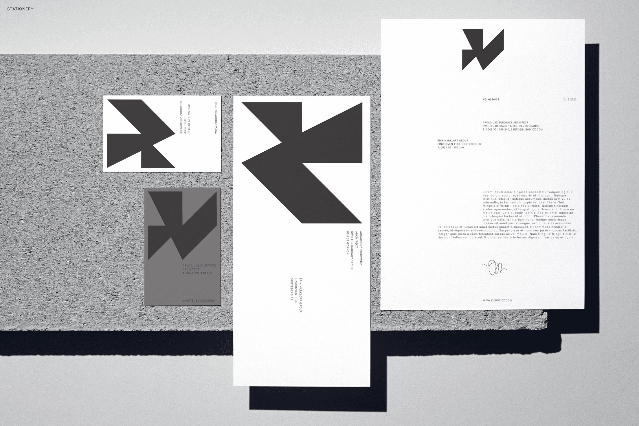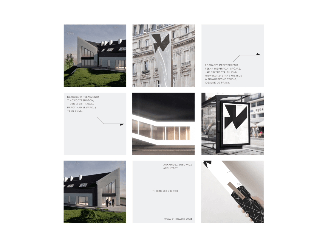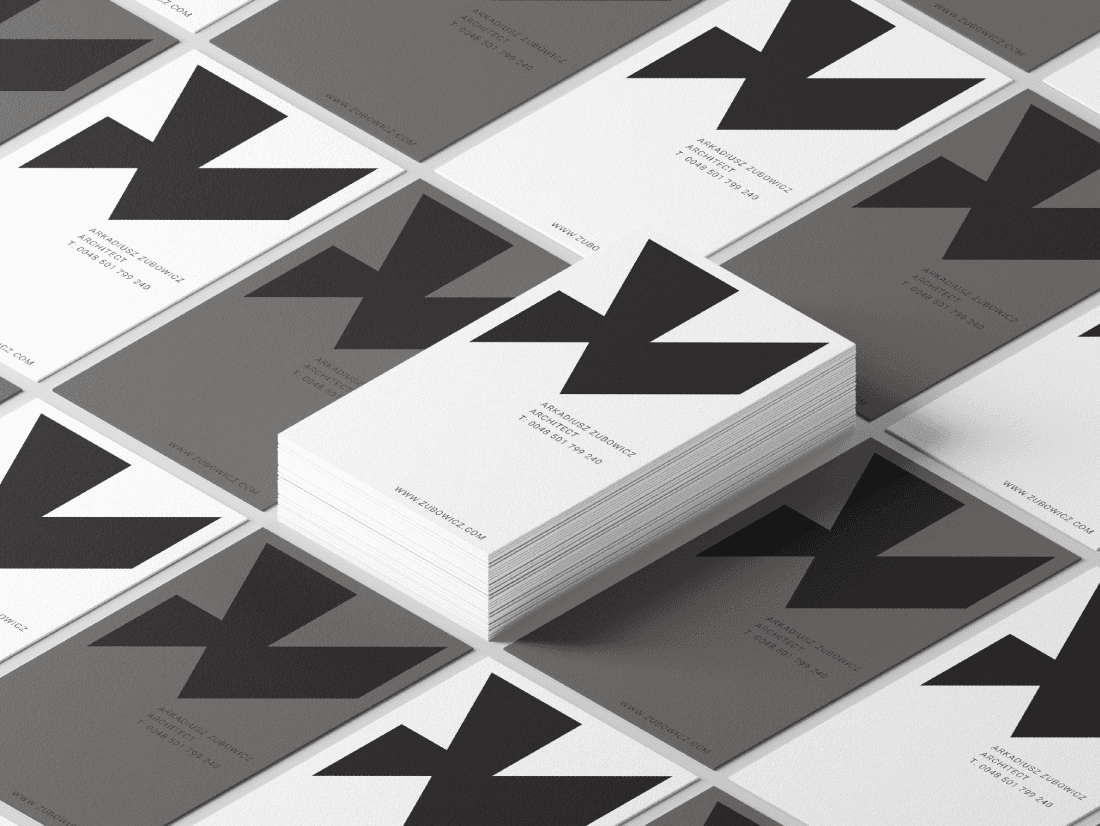 Logo design and brand identity system for Architect Arkadiusz Zubowicz, a distinguished figure in the world of modern architecture, renowned for his innovative approach that marries the elegance of modernist principles with asymmetry and the raw abstract beauty of unrefined materials. Architect Zubowicz draws deep inspiration from the modernist movement, which emphasizes simplicity, clarity, and the honest expression of materials. His work showcases a bold use of raw materials such as concrete, sandstone, slate, basalt, quartzite - creating structures that are both visually striking and deeply functional. The fascination with asymmetry which allows to break away from conventional forms, introducing a dynamic and unexpected elements to the designs was the key to create a visual identity that reflects architectural language of Arkadiusz Zubowicz.