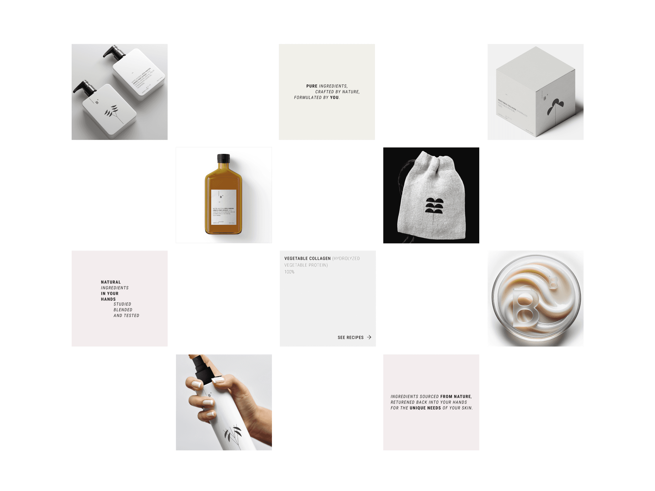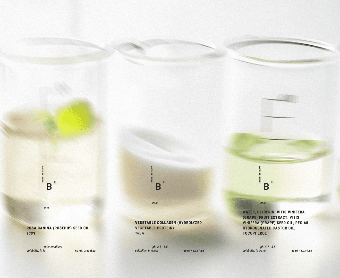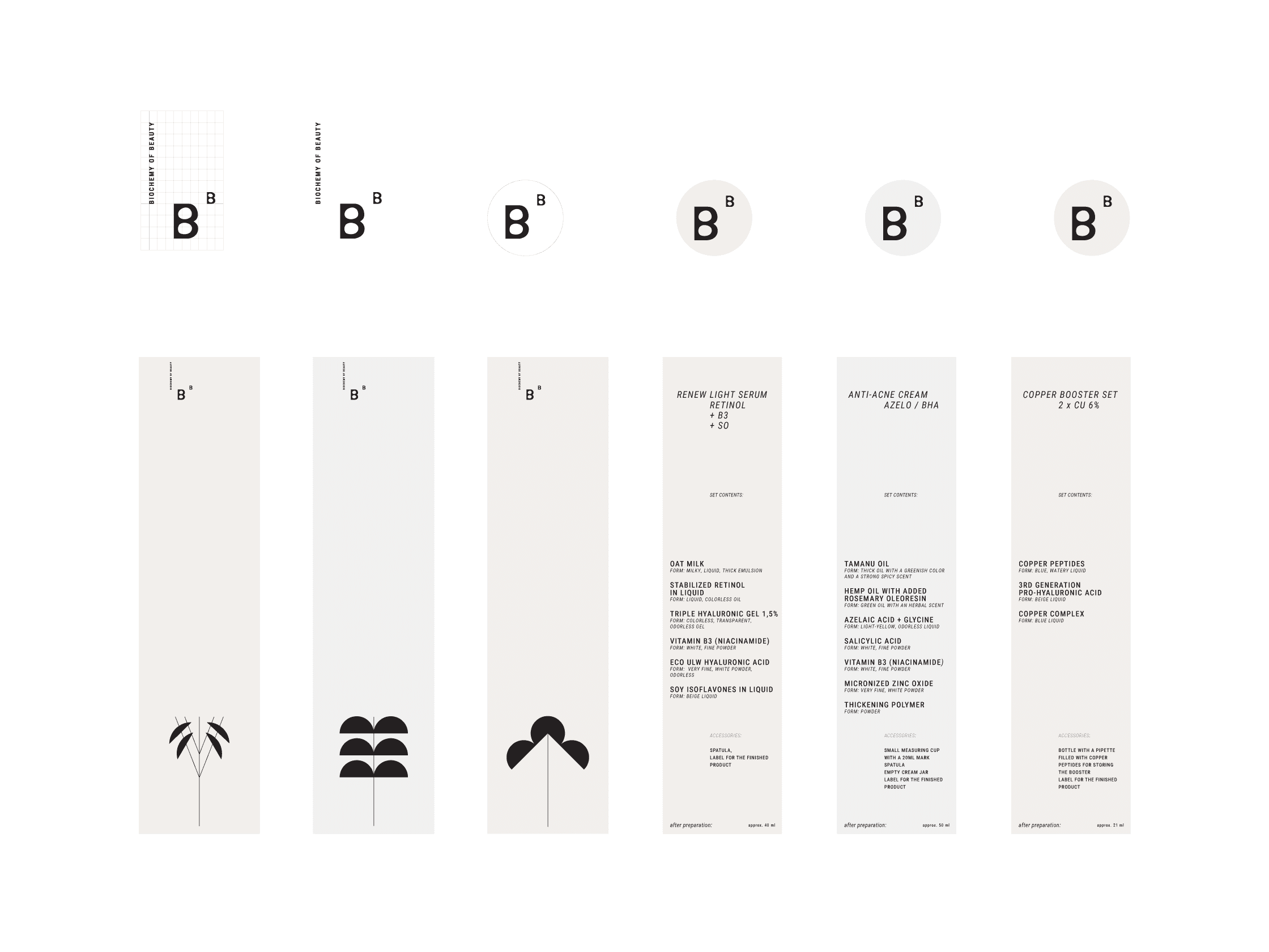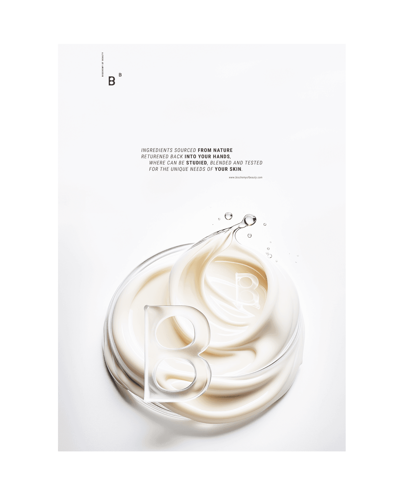 Biochemy of Beauty brings the power of pure, unadulterated ingredients back into the hands of the consumer, where natural ingredients can be studied, blended, and tested. A brand identity emphasizes purity, nature, and scientific rigor. The logo combines two letters B, simple and clean sans serif with a little touch of natural shaped bubbles and arranged in a way that reflects a chemical element of the periodic table. I chose a color palette of earthy tones in soft, pastel clean whites to evoke a sense of natural purity and scientific precision. Packaging use recyclable materials, with informative labels that detail ingredient properties, usage instructions, and safety precautions. The design is clean and minimalistic, reflecting the brand's commitment to purity and quality. By focusing on the core values of purity, empowerment, and sustainability my main goal was to empower the dedication to quality and the art of DIY formulas, what lead me to: 1. Empower beauty enthusiasts with the role of raw ingredients and precise formulas and tools to create their own personalized skincare and cosmetic products. 2. Empower the movement towards transparency, sustainability, and the purity of crafting one's own beauty solutions. 3. Empower unique and fulfilling experience to every customer who chooses to embark on this journey. 4. Empower customer engagement to share their creations and experiences on social media, fostering a sense of community and shared learning.
